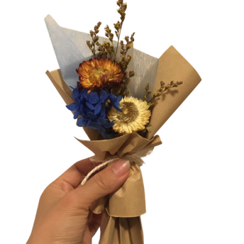 These mini bouquets are real preserved flowers with big varieties available, such as hydrangea, lovers grass, eucalyptus, chrysanthemum, billy buttons, pampas, etc.